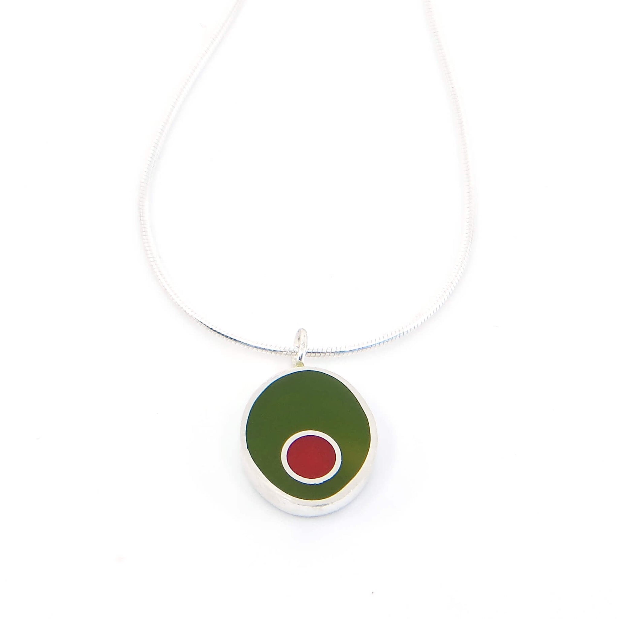 Chunky, colorful, contemporary, and striking oval pendant with a vertical silver squiggle and rich pop of color. The sterling silver oval filled with pigmented resin that is sanded down flush with the silver.