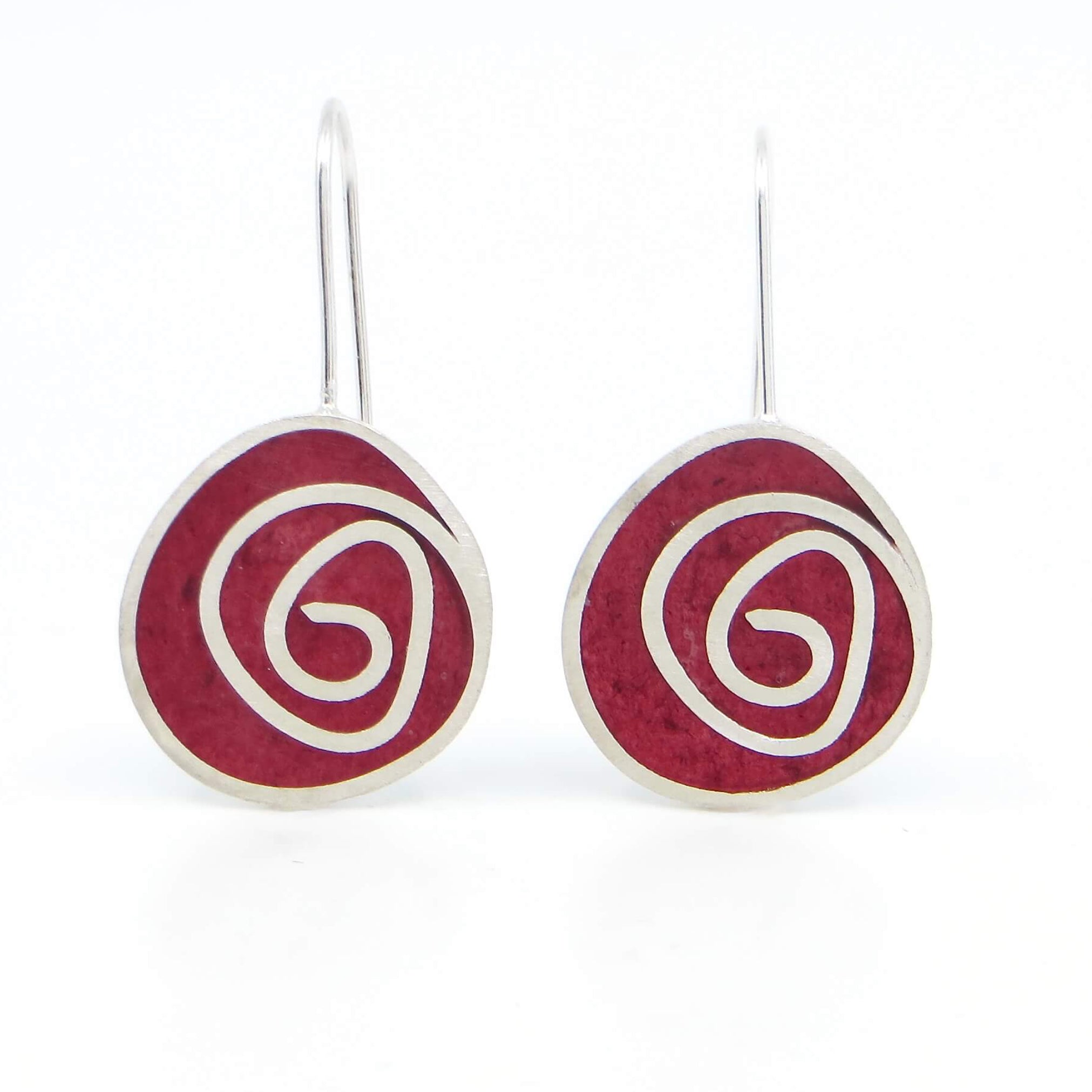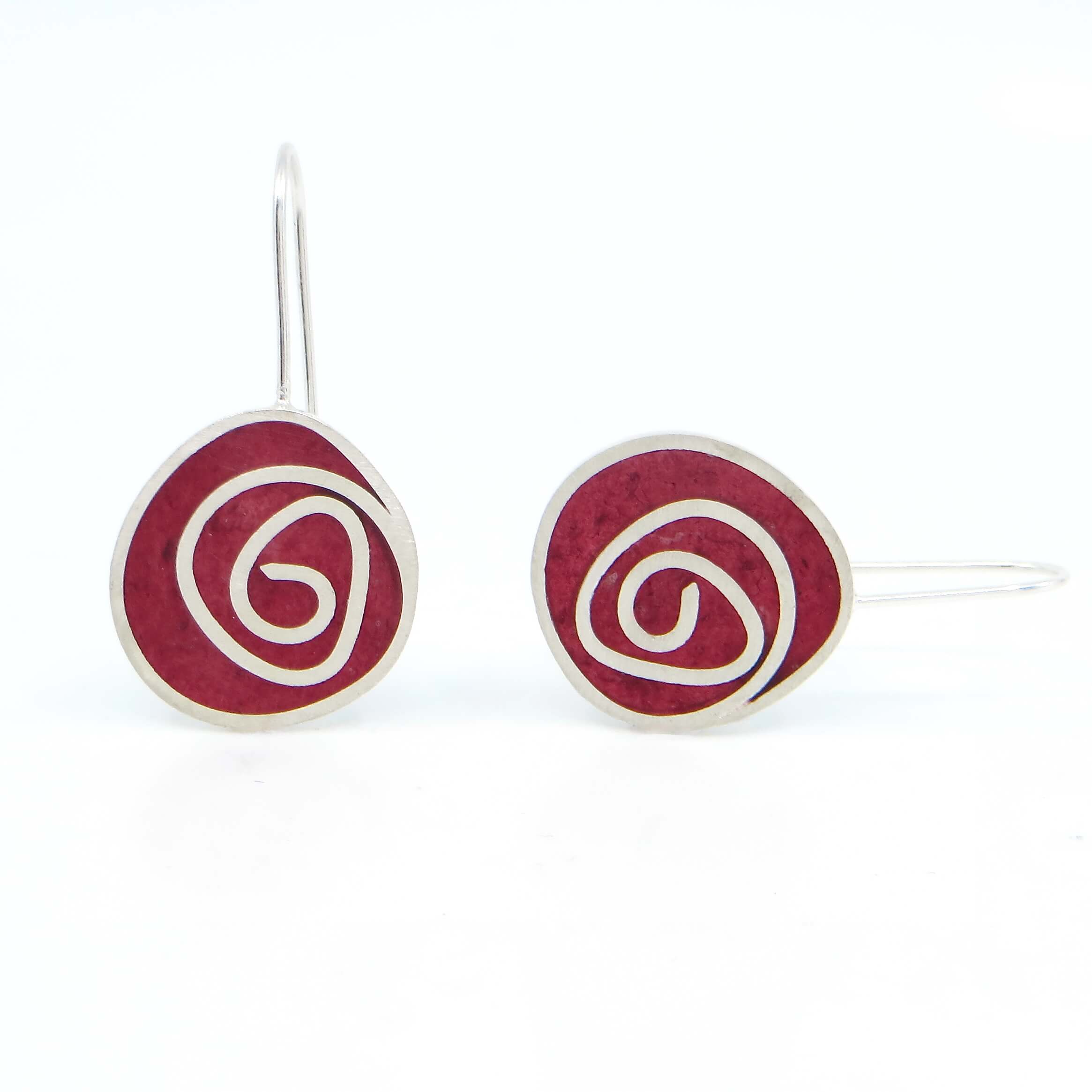 Contemporary and colorful earrings add a perfect pop of color. These sterling silver and resin inlay earrings remind some people of Macintosh roses.
